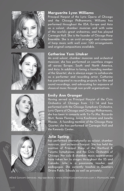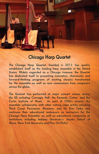 Chicago Harp Quartet. I like the constrast I got from the black and white outside, with the lush, savory, warm inside photo. The front cover, you might notice, is an odd-looking room: that's because I had to extend a photo that had them looking nice, but wasn't portrait orinented. As of my writing this, they seem to have a newer line-up, and as such, MUCH NICER RESOLUTION PHOTOS. (*wrings hands in agony*)