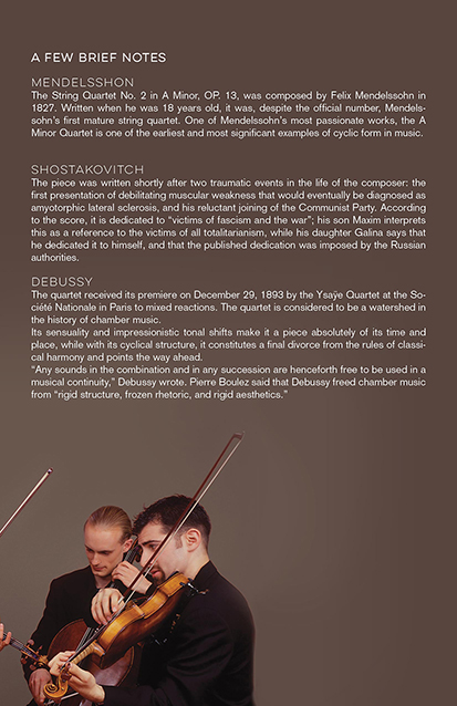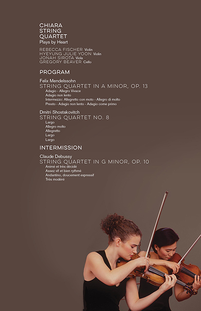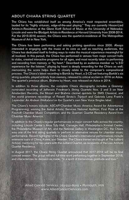 Chiara String Quartet. This program was part of their last tour together as a band. I'm most pleased with the spread, particularly with the setlist itself; often, it's a bit of a challenge to structure a decided performance list interestingly when it's got lots of movements, and I think this was one of my best. (and by decided performance list, I mean they're not listing "you might hear this" pieces)
