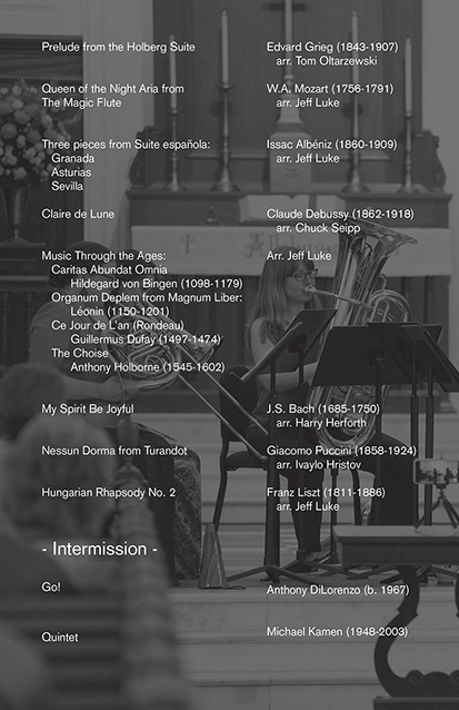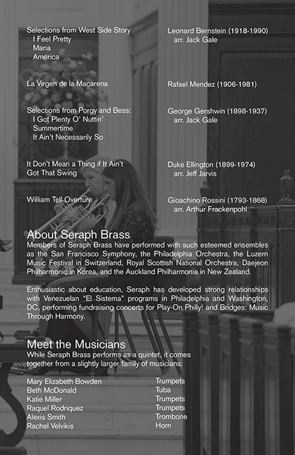 Seraph Brass. To summerize a bit reductively, glamourous women playing brass instruments. This is actually the first version I produced, as they've had a few line-up changes in the past 2 years, but this one's my favorite. I like using white text when I can (and you've probably picked up on that), and pages 2 and 3 came together really nicely.