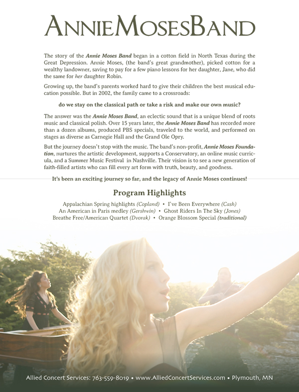 Annie Moses Band. Most of their pictures online were too wide, or just... eh. So for this one, I took a screenshot from a music video, and then photoshopped in the sky. It's become one of my favorites, TBH.