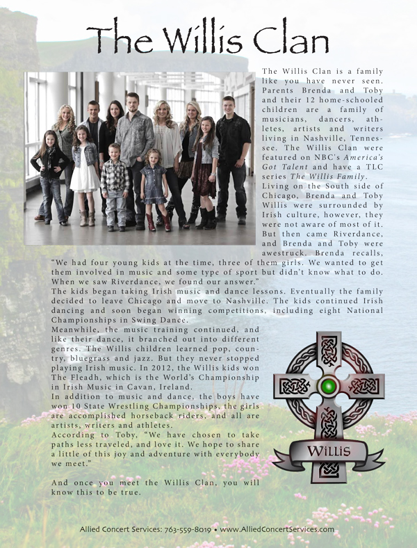 The Willis Clan. It appears the older children are trying to recussitate their music career, but this was a real sad situation. I was working on their program, when I was told to abandon it, and do something else. My contact at Allied wouldn't explain, so I googled it, and discovered the horrible sexual abuse perpertrated by their father, which torpedoed everything.