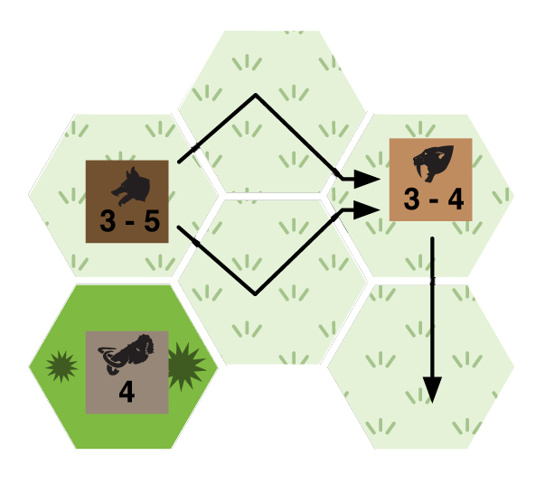 Player arranges most animals on the board, with the goal to bring back a predetermined quarry. Move animals as normal. For a challenge, limit game to 10 turns.