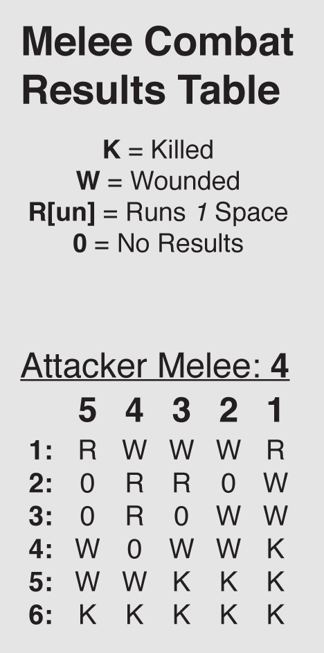 The CRT that is consulted is based on both warriors’ melee strength. In an example of a Orc Club of 4 and a Human Axe of 3, the CRT that is used is marked 4/3. Or if it’s that same Orc Club versus a Human Knife, the table would be marked 4/2.