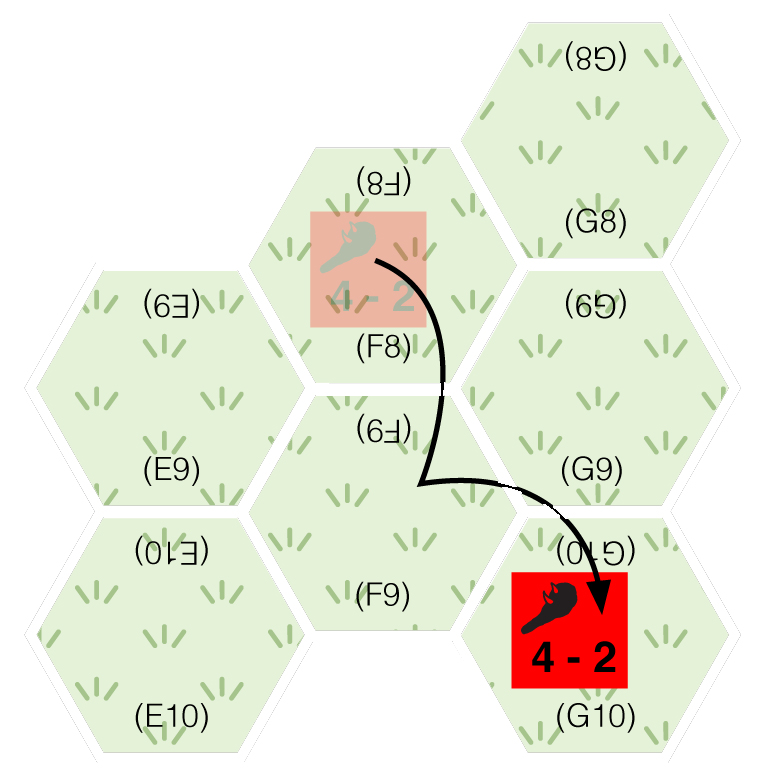 When two units share a space, spaces next to one another, or pass each other en route, players may initiate melee combat. Combat is resolved with a Combat Results Table (CRT) and a unit’s melee stat.