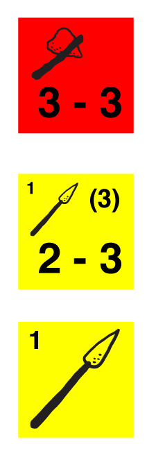 These units have a range indicated in brackets on the upper right corner. This number relates to how far a warrior can dislodge a missile. The number in the upper left correlates with a spear/atlatl token. The unit’s melee strength is significantly less when they’ve thrown their weapon, as they will need to retrieve their thrown weapon after a volley. The only exception is the sling warrior, who can rely on stones/rocks they pick up.