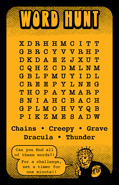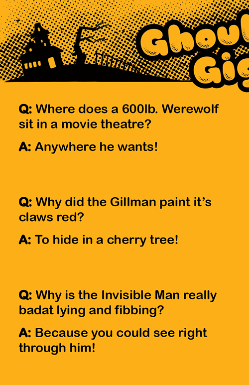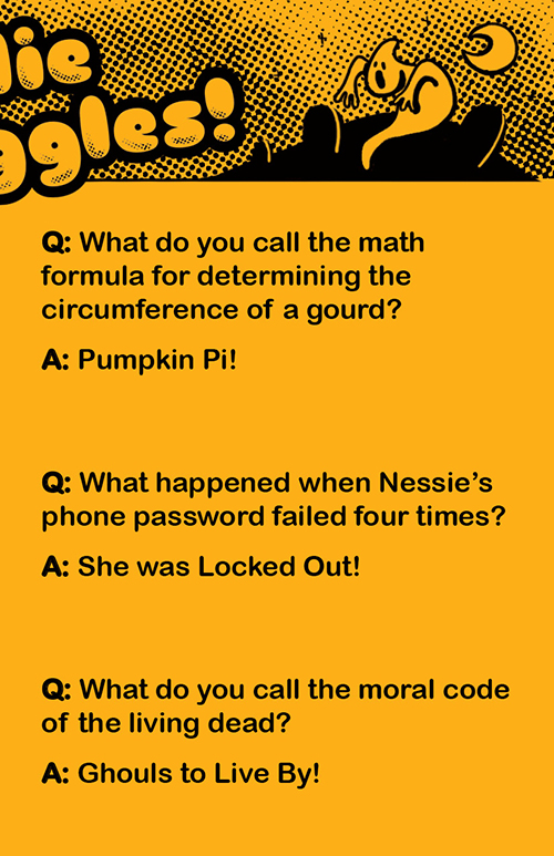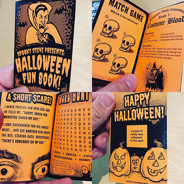 For Halloween 2019, I decided to give more than just candy to local Tricker Treaters, by way of a little 8-page booklet with a little sweet taped to the back. Jokes, puzzles, a piece of age-appropriate Creepypasta, and a recipe for something gross that could be made in any kitchen. There's four distinct versions, so grabbing one at random might be different for one kid to the next.